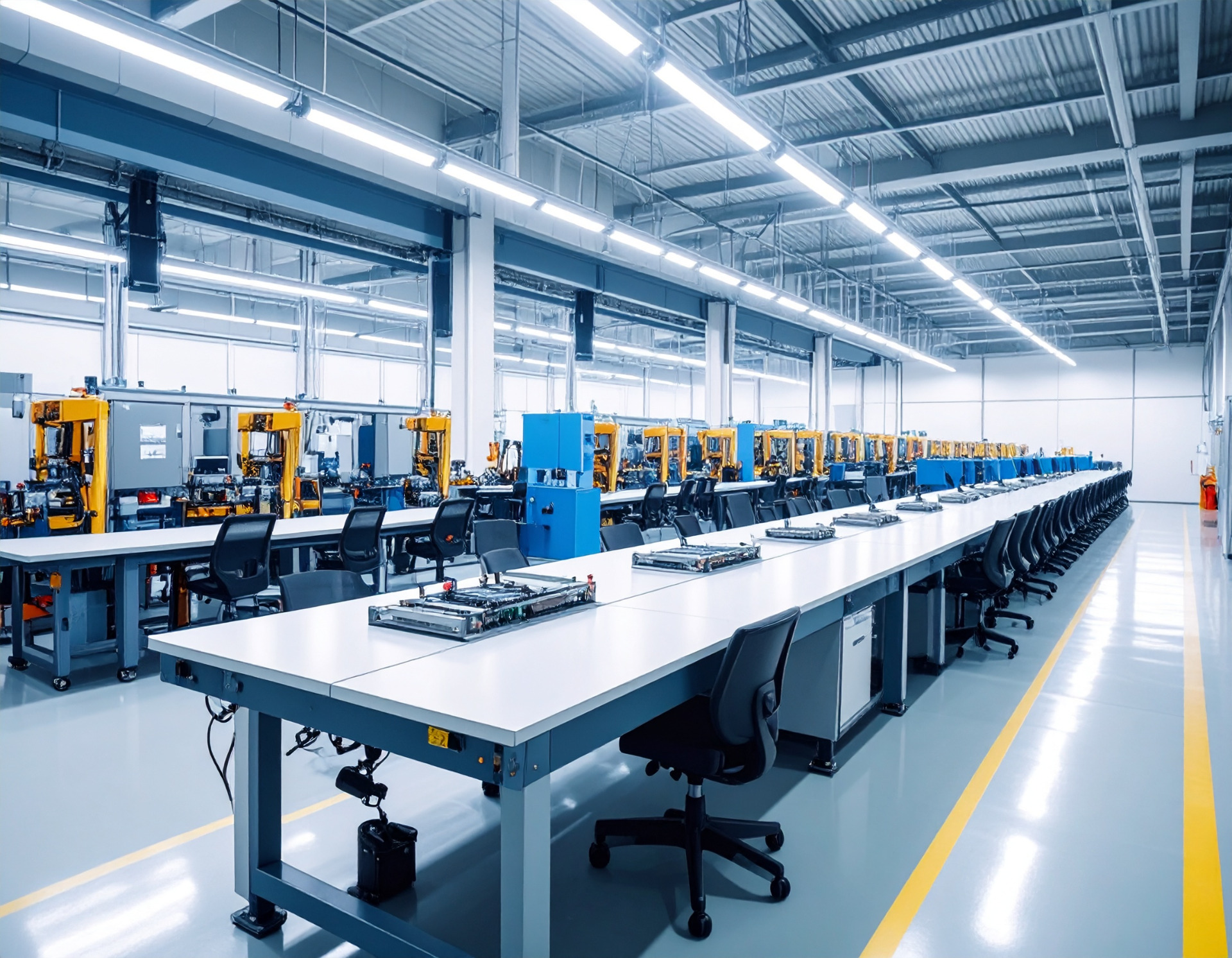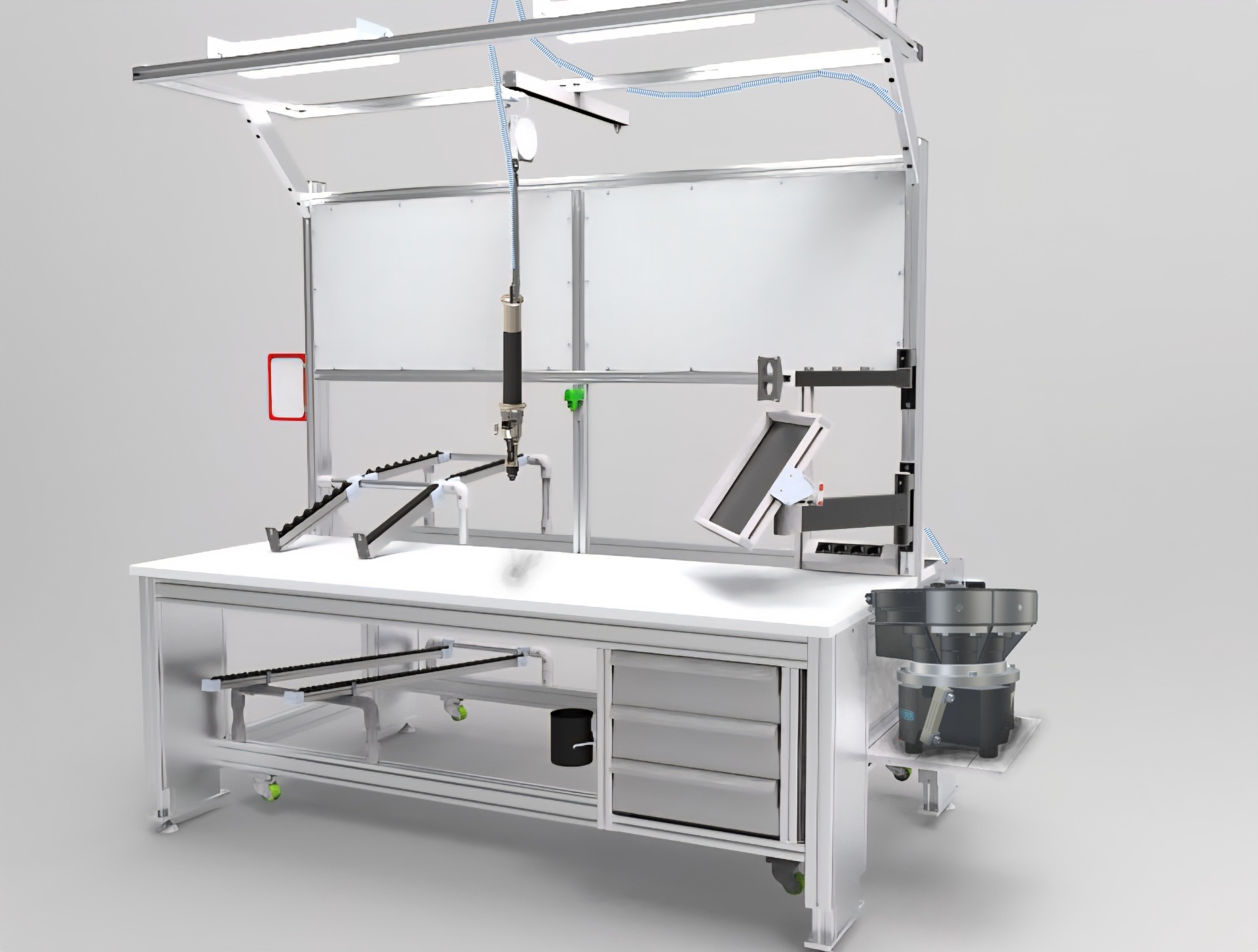 - Ergonomická výškově nastavitelná montážní pracoviště.