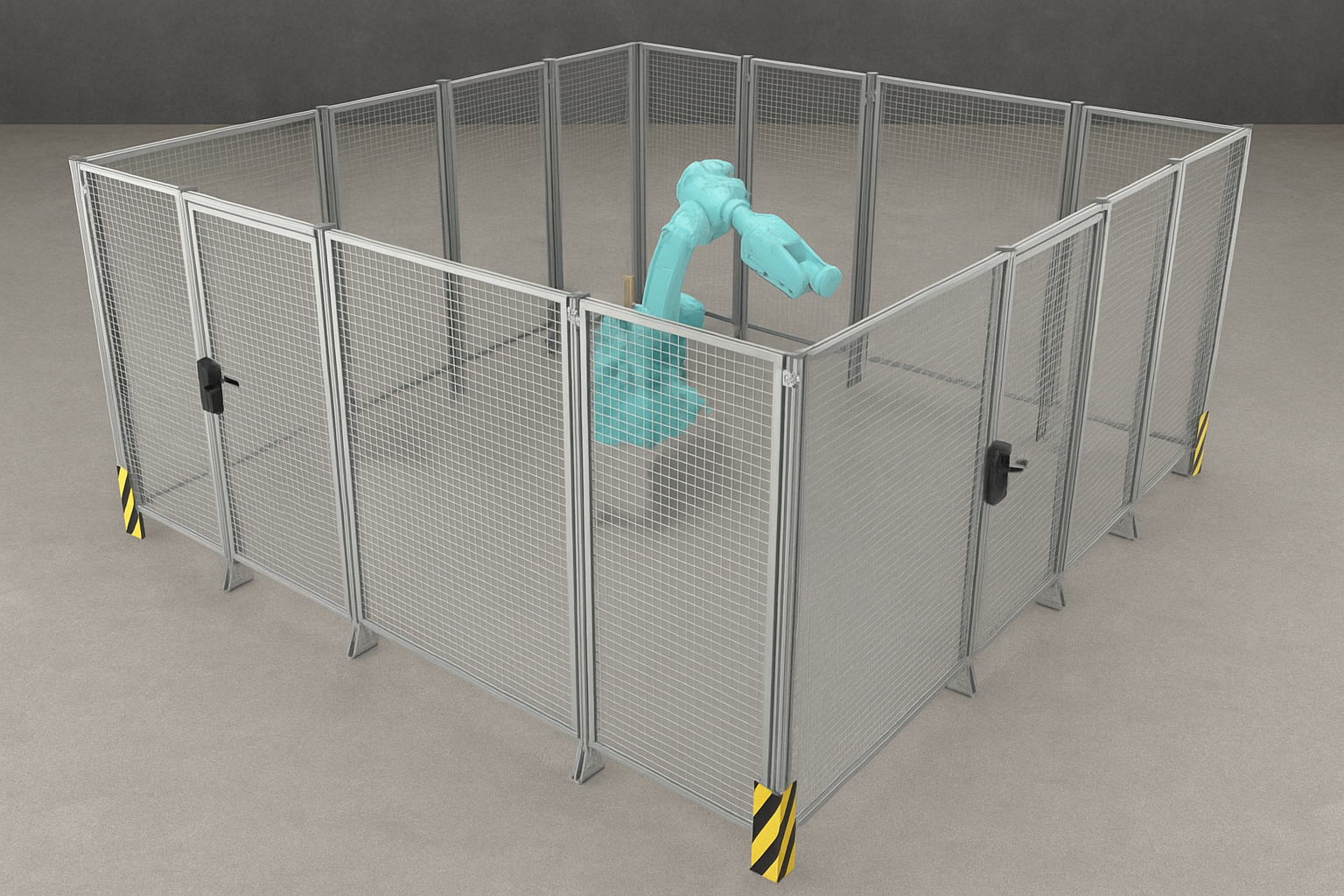 bezpečnostní kryty a klece montážních linek a robotů, ochranné dorazy, zábradlí